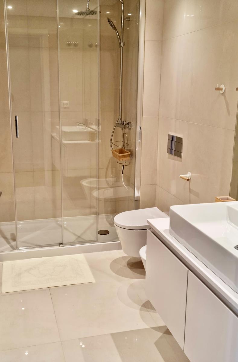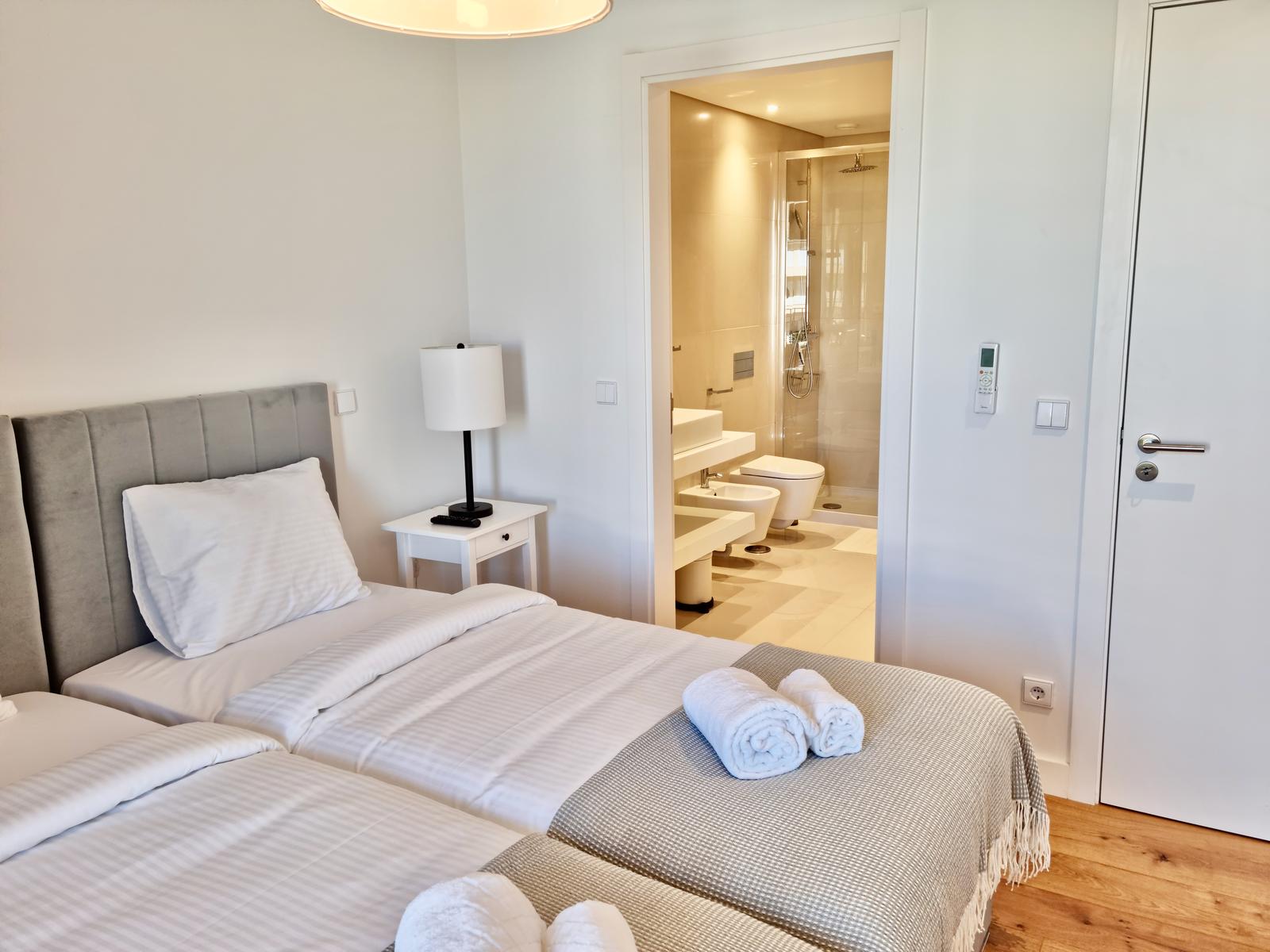 Modern design characterises the apartment’s interiors, with a luminous open-plan arrangement that perfectly interlinks the living spaces. An all-fitted, most elegantly appointed kitchen in quality finishes is complemented with top-grade appliances. It extends via glass doors onto a chic living and dining room perfect for while away hours, relaxing or entertaining. Large windows and double glazing invite natural light to dance across the rooms, while thermal and roof insulation ensure optimal comfort year-round. Each bedroom, with its en-suite, is a haven of privacy and tranquillity, featuring contemporary finishes that exude understated luxury.