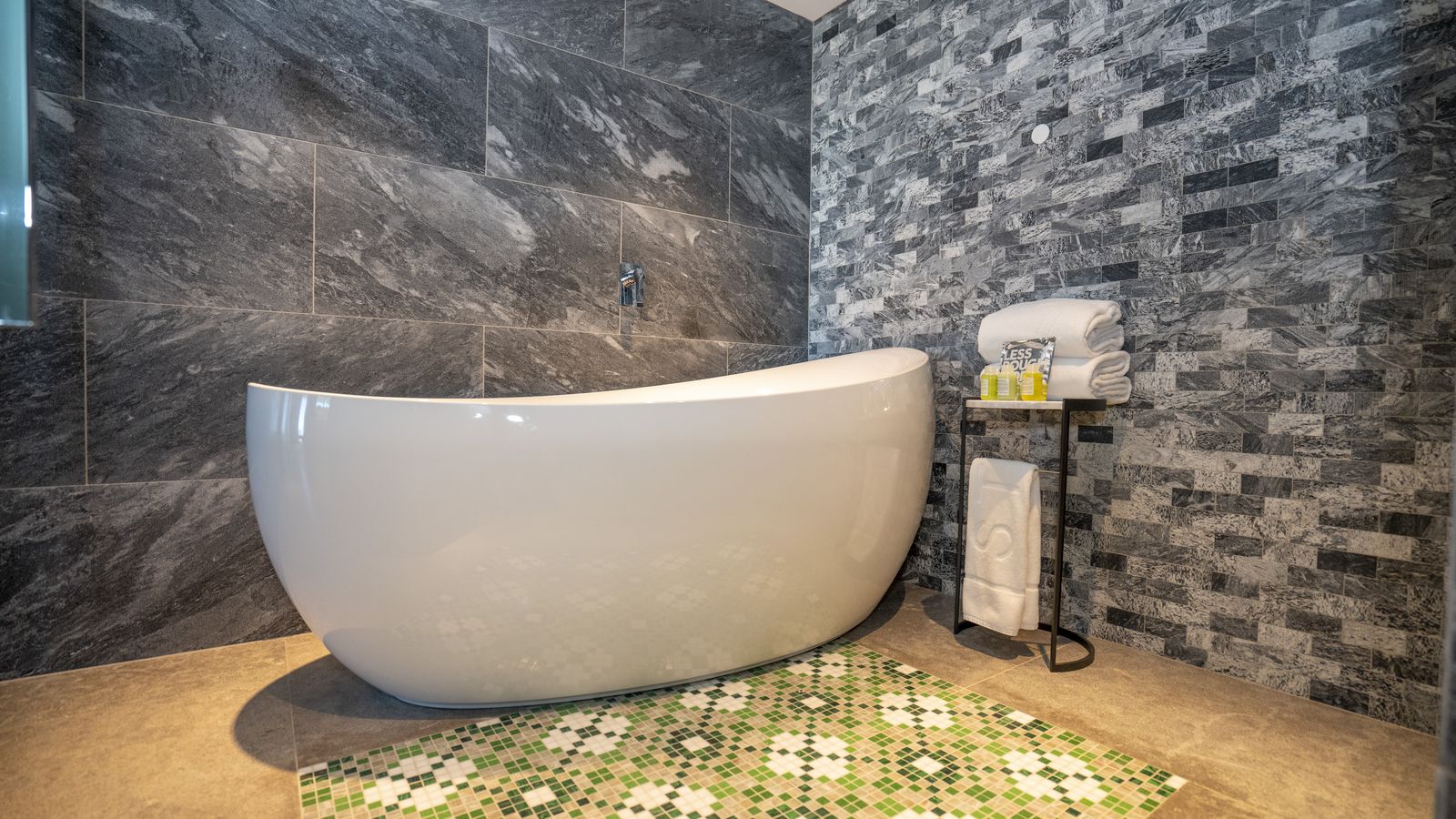 Free-standing bathtub and shower enclosure in master bathroom of two, three and four bedroom residences.