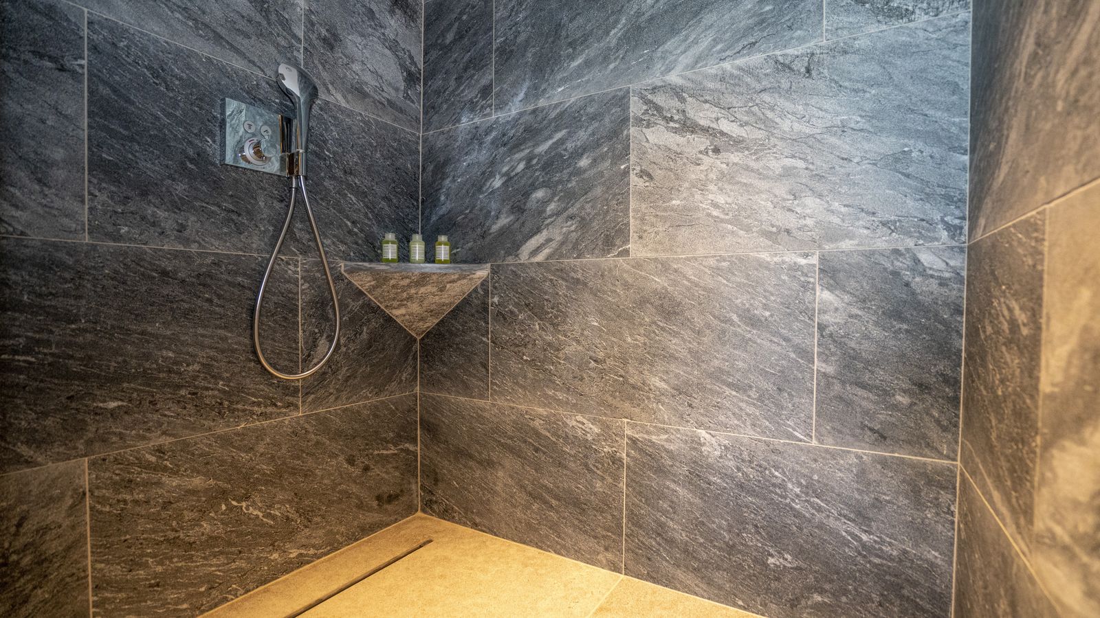 Hansgrohe rain and wall-mounted showerhead, with wall-mounted thermostatic controls.