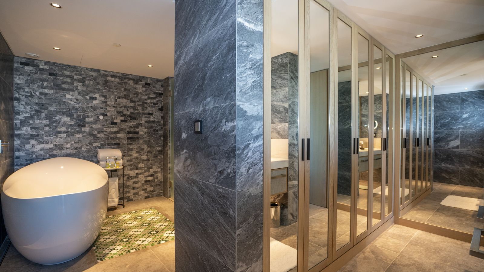 Century blue stone and Bisazza glass mosaic in bathrooms.