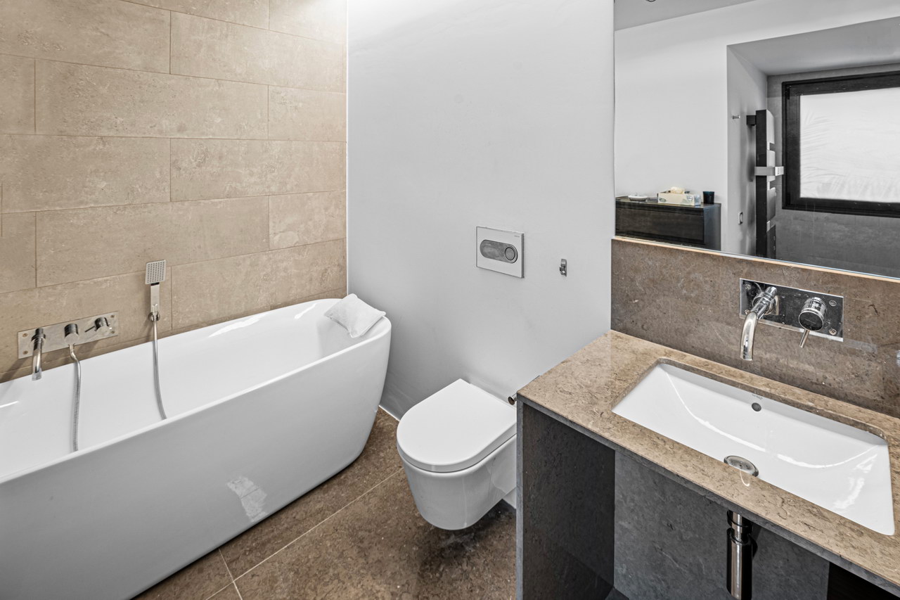 As you step inside, a spacious living area welcomes you with expansive windows that frame the scenic outdoors, seamlessly connecting the interior with the landscape beyond. The fully fitted designer kitchen features high-end appliances and a sleek dining area, making it the perfect space for both casual meals and elegant entertaining. The villa also offers a dedicated study or office space, ideal for working from home in style and tranquillity.