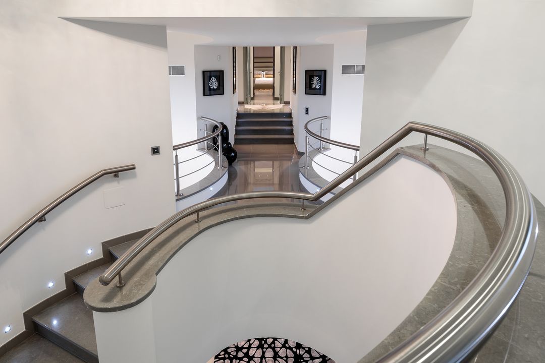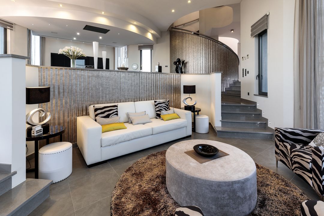 Inside, the villa boasts a wealth of luxurious amenities. Each of the five bedrooms is designed for comfort and privacy, featuring en suite bathrooms and dressing areas. Ascend to the top floor lounge, where floor-to-ceiling windows offer 360-degree views of the surrounding landscape, creating an oasis of tranquility.